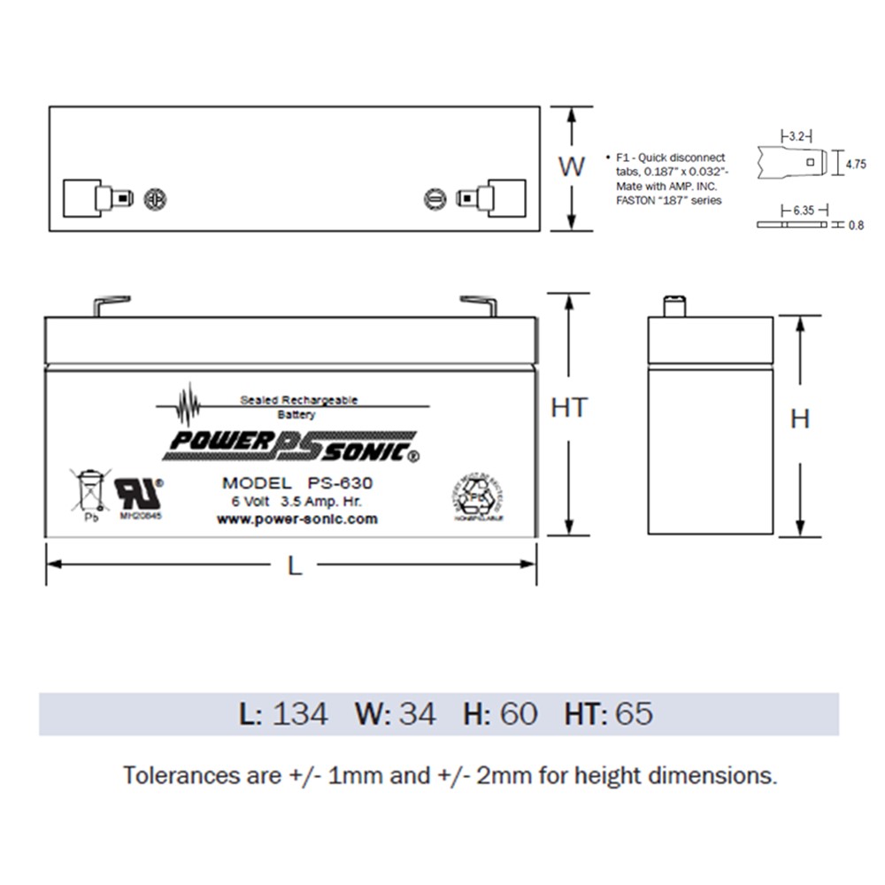 6 Volt 3.5AH, 20 hour sealed maintenance-free rechargeable battery.