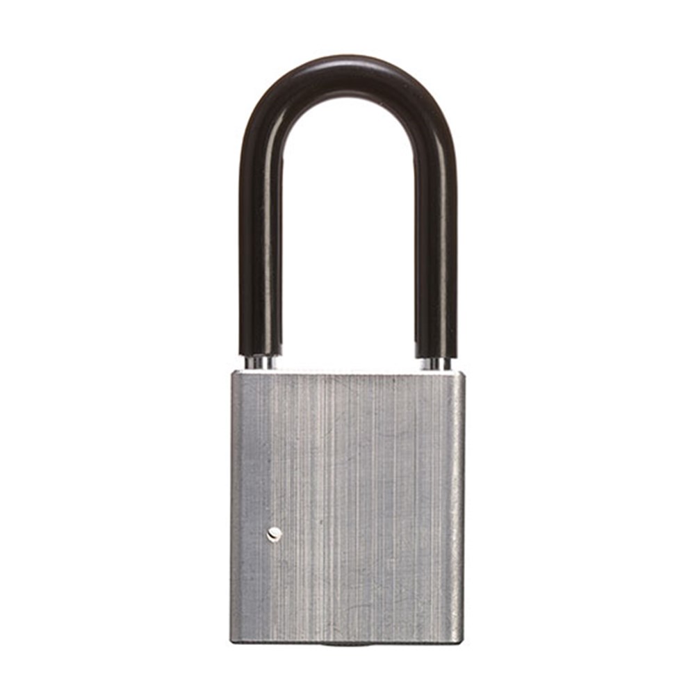 The sub-assembled ABUS 74/40 is a lightweight aluminium padlock without a vinyl cover encasing the body and shackle that provides protection against electric shock.