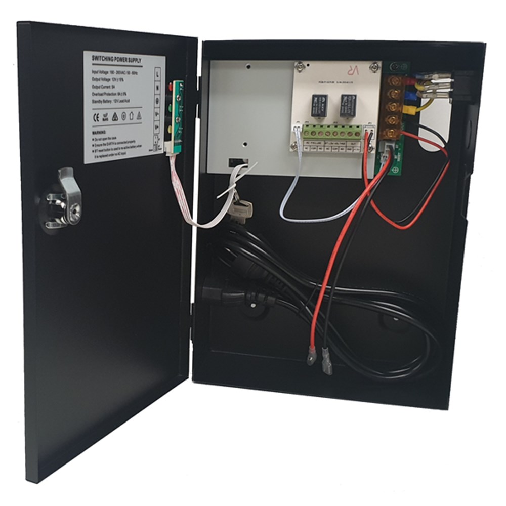 CS Technologies 12VDC 5Amp Power Supply with Battery Charging, AC Fail and Low Battery Monitoring, in Black Lockable Metal Enclosure - CS9001