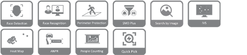 AI by Camera: Face detection and recognition, perimeter protection; SMD Plus; ANPR; people counting; stereo analysis; heat map.