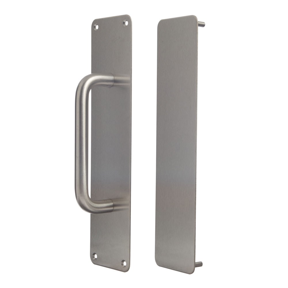 dormakaba concealed and visible fix stainless steel push and pull plates for fixing back to back through the door.