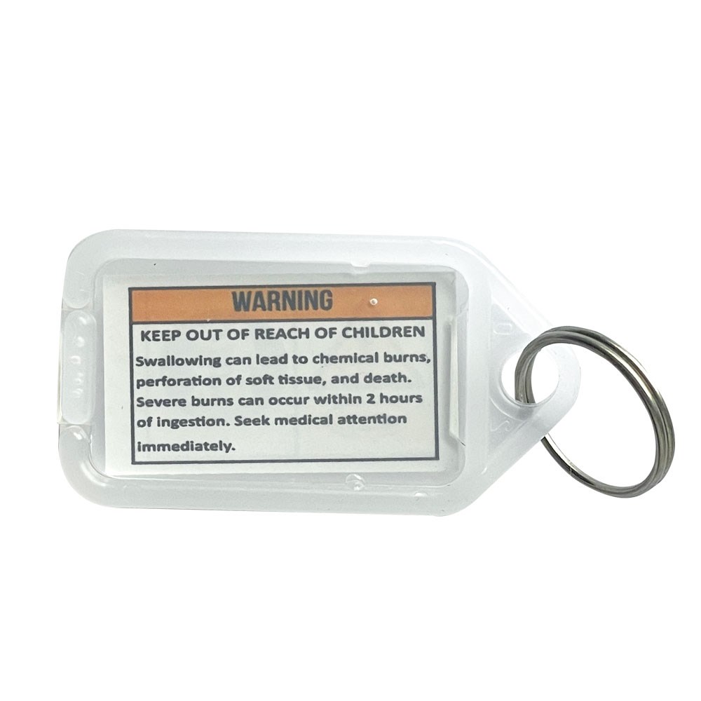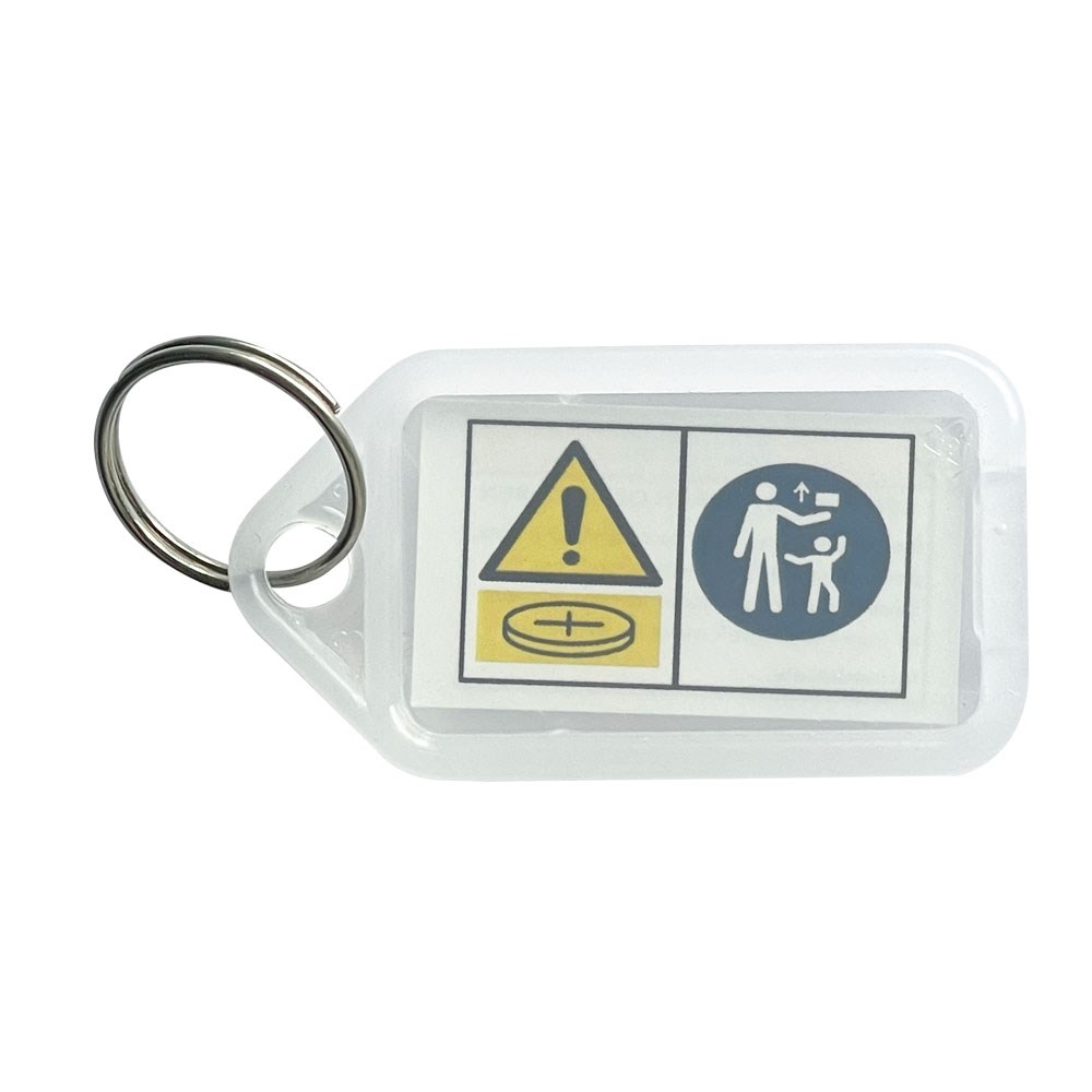 Kevron ID5 clicktags in clear with the legally required coin cell battery warning label printed inside.
