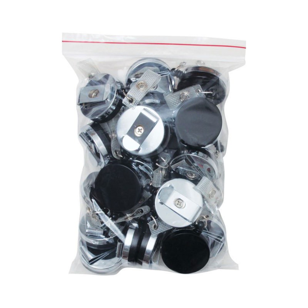 Kevron ID23 heavy duty retractable clip-on reel with a black front and chrome back. Slide type belt clip with nylon cord.