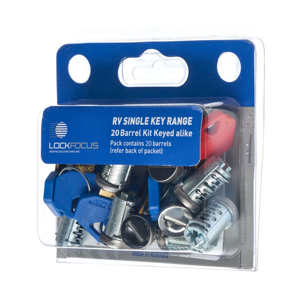 Replacement kits for all lock housings capable of being fitted with Lock Focus 'RV Single Key Range barrels. Kits are supplied with dust covered stainless steel capped zinc plated barrels with keys and 2 Red exchange keys to remove the old barrels.