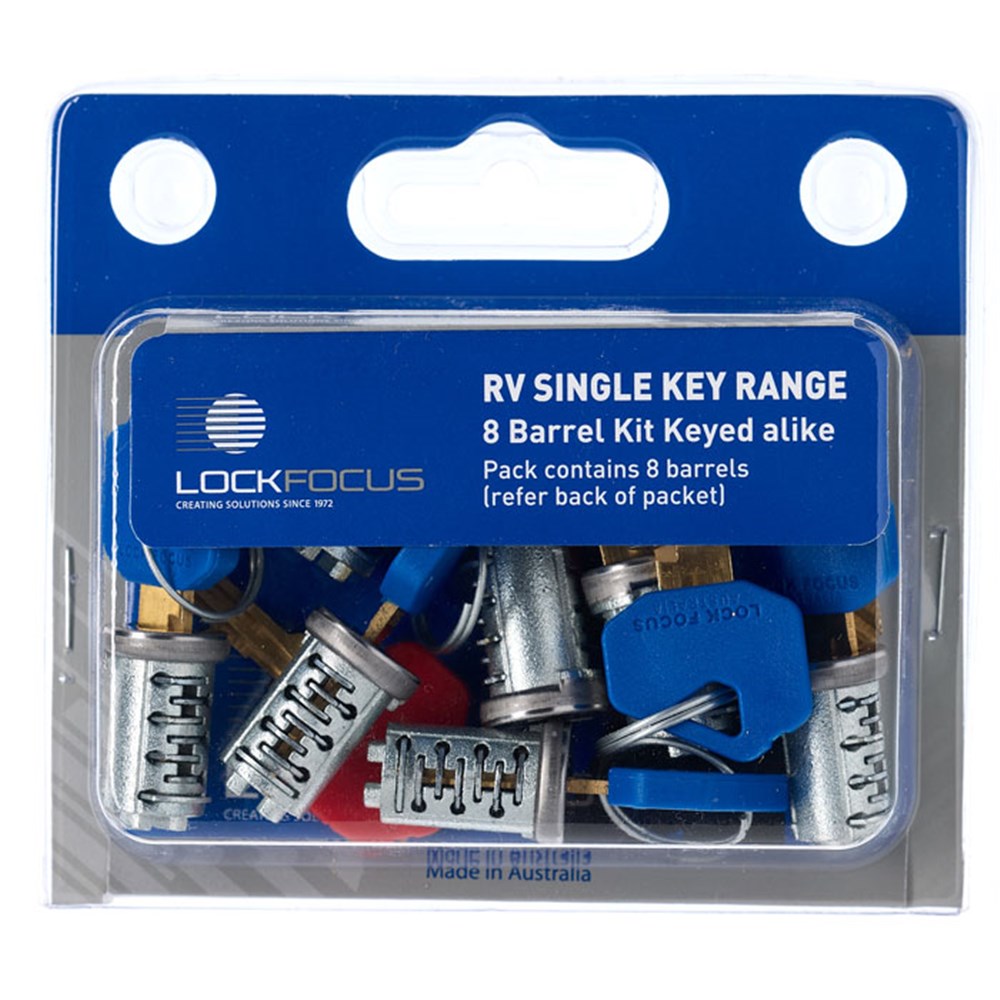 Replacement kits for all lock housings capable of being fitted with Lock Focus 'RV Single Key Range barrels. Kits are supplied with dust covered stainless steel capped zinc plated barrels with keys and 2 Red exchange keys to remove the old barrels.