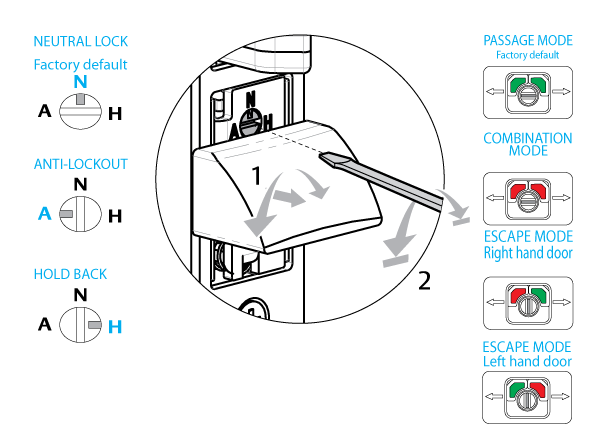 All handing setting (Passage, Combination or Escape) can be adjusted via the hub selector located under the face plate.