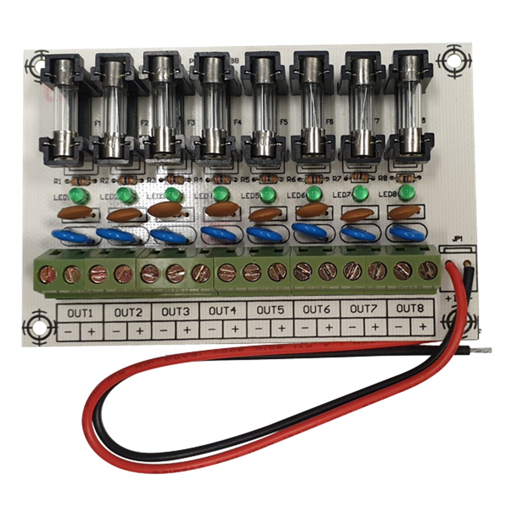 The NEPSM8OUT is designed to be added to the Neptune NEPSDC5A01B 5AMP Power Supply. It has 8 individually fused outputs, each with a replaceable 500mA fuse, LED indicators on each output and is supplied with mounting screws and standoffs.