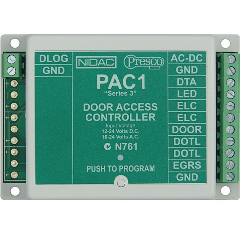 The PAC1 is a single door access controller that ensures secure door access due to the separation of the controller from the keypad or proximity reader. The unit can be easily programmed onsite using a keypad or via a PC with a PEL1.