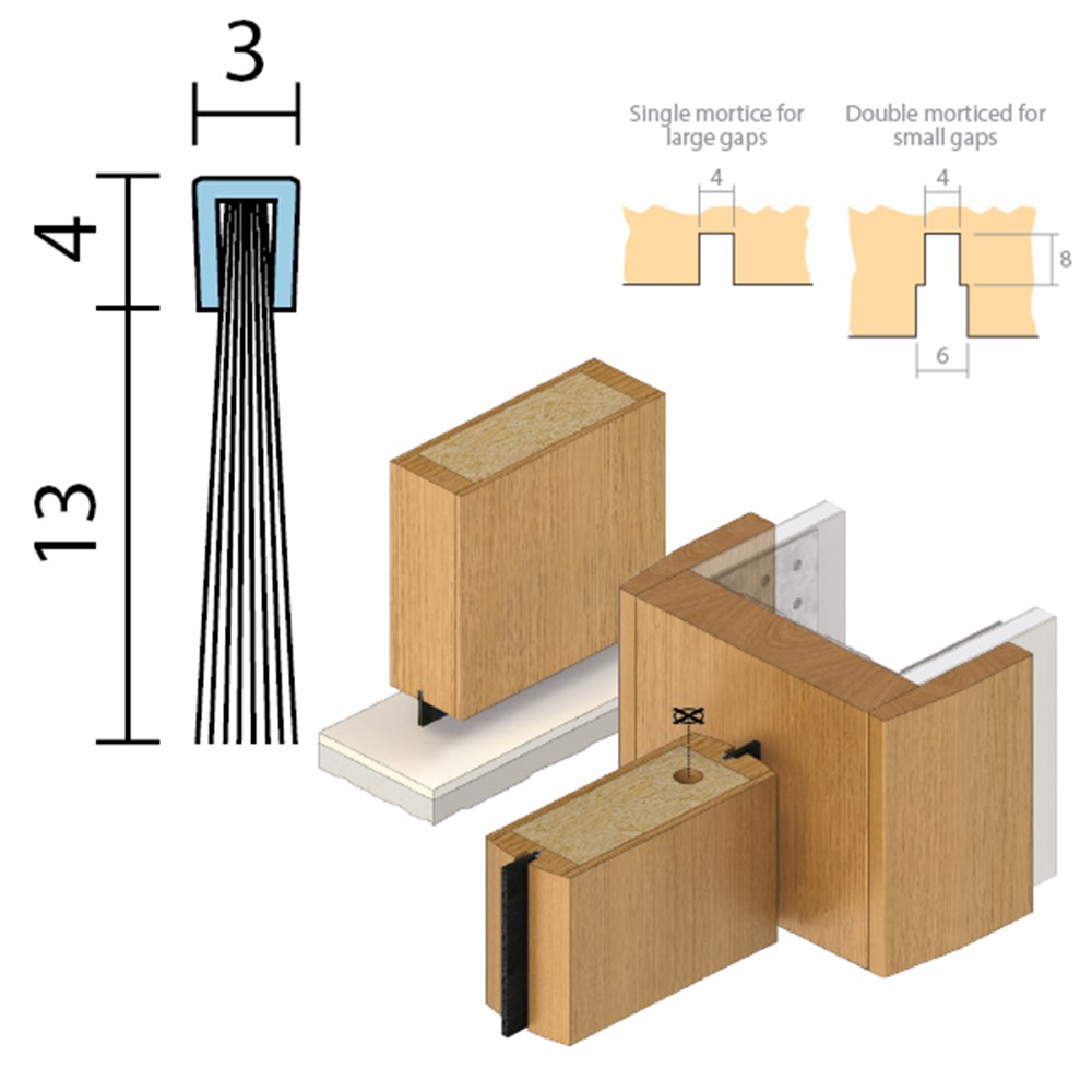 Fixing: Inserted into morticed groove (optional adhesive if required). Where a small clearance is encountered, the groove should be double morticed to allow the brush to flex.
