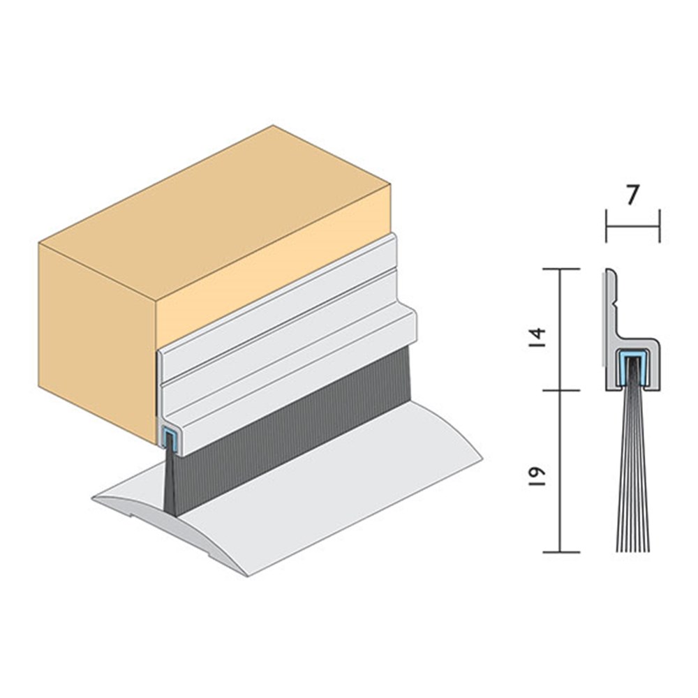 A nylon brush strip seal with an anodised aluminium carrier that mounts to the inside or outside of a door. It is ideal for sliding or double acting doors.