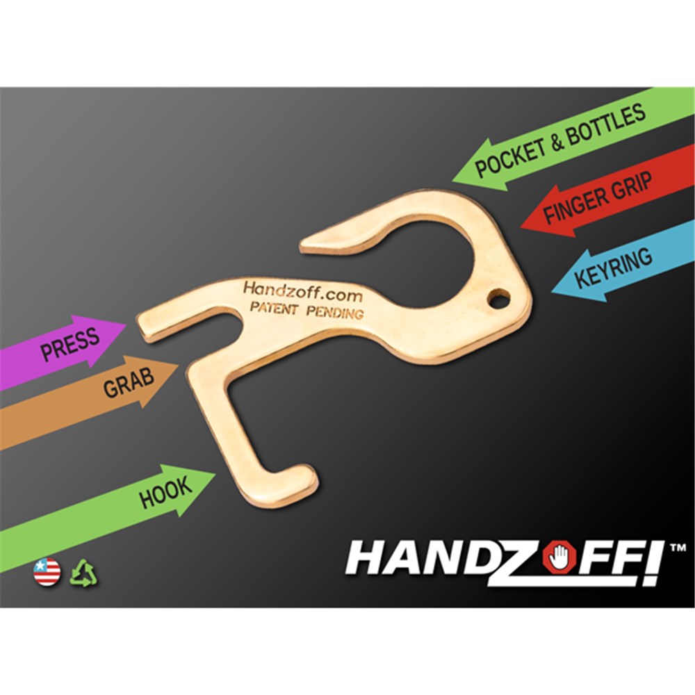 HandzOff is made from 100% recycled brass, a copper alloy proven to have an effective, ongoing anti-bacterial effect.