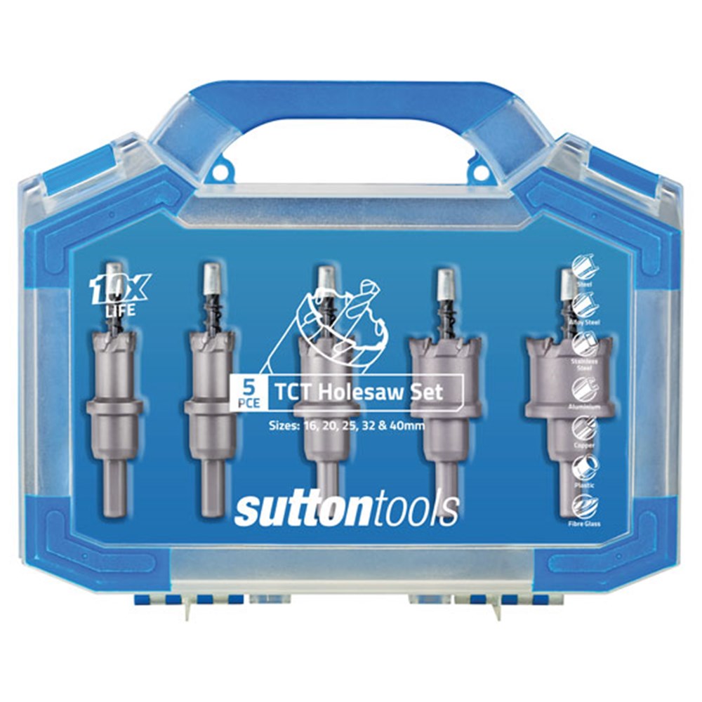 Sutton Tools TCT holesaw set includes 16, 20, 25, 32 & 40 mm holesaw all in a handy carry case.