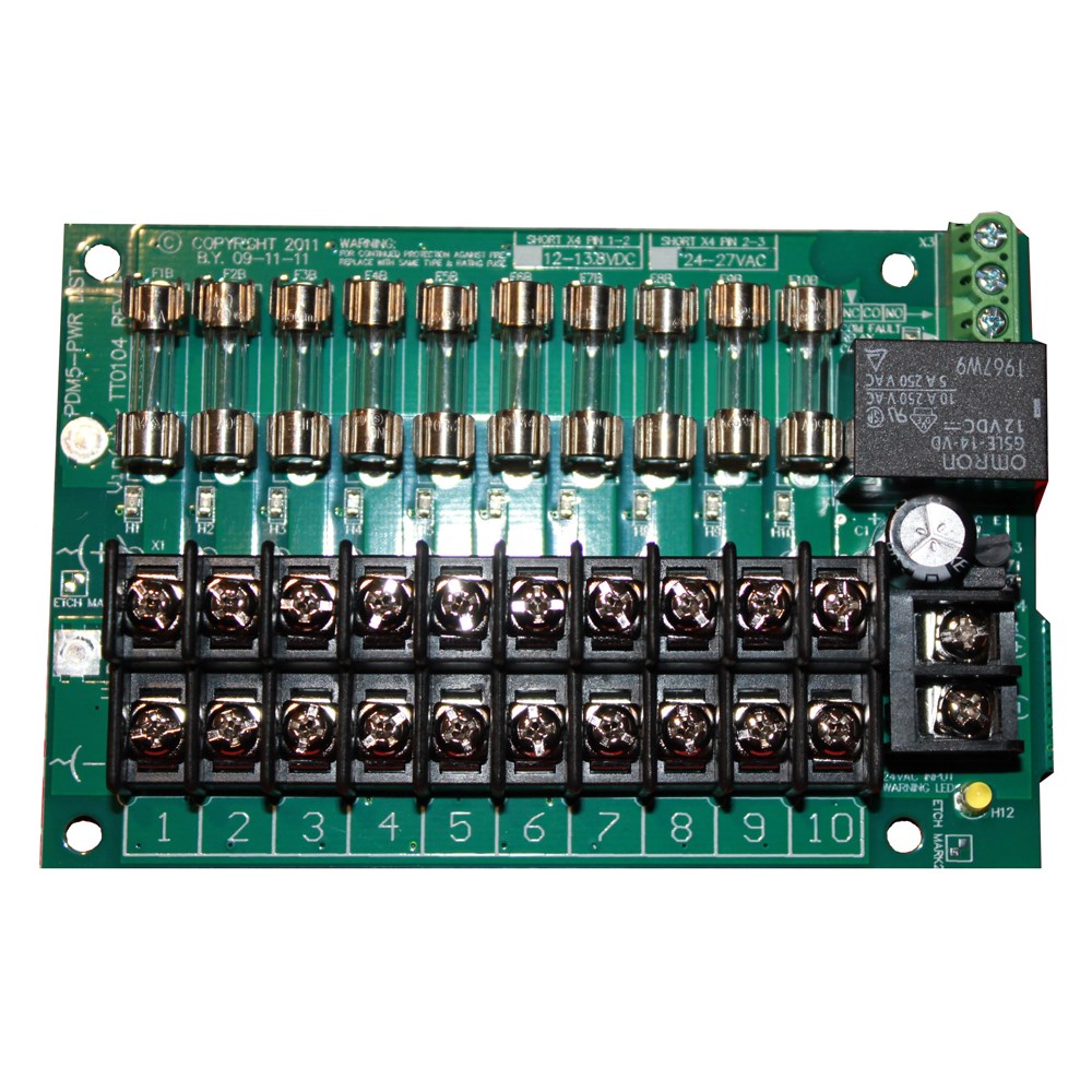 The PDM5-1A, suitable for both 12Vdc and 24Vac (with an on-board switch), reduces the chance of a complete system shutdown if a short circuit occurs on any single circuit run. It features cutting-edge Surface Mount Technology and ten individual fused 1A M205 circuits with LED indicators for fuse status.